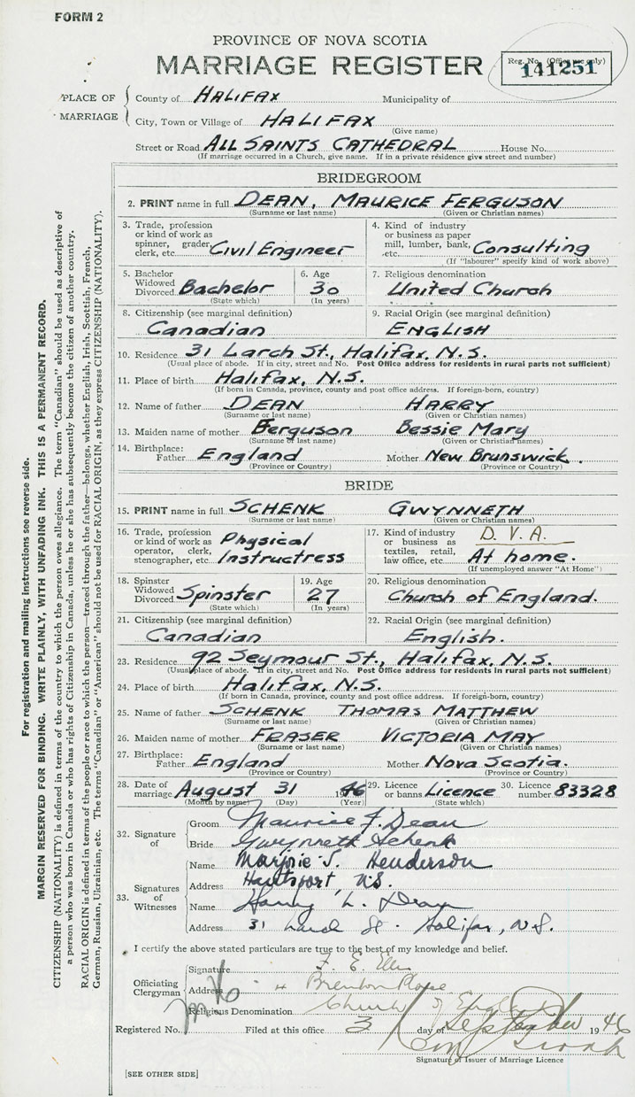 28. Date of marriage August 31 1946 29. By license or banns License 30. License number 83328