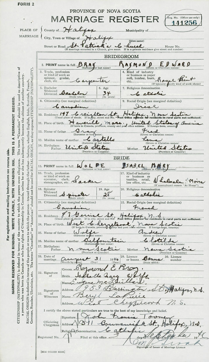 28. Date of marriage August 31 1946 29. By license or banns License 30. License number