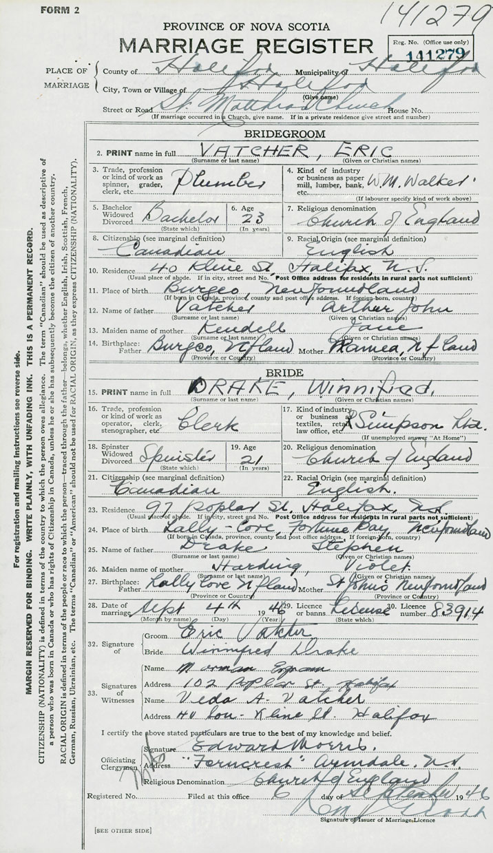 28. Date of marriage September 4 1946 29. By license or banns License 30. License number 83914