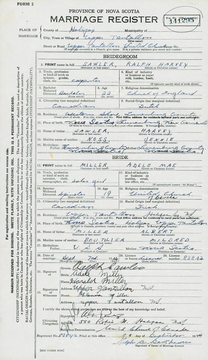 28. Date of marriage September 7 1946 29. By license or banns License 30. License number 83842