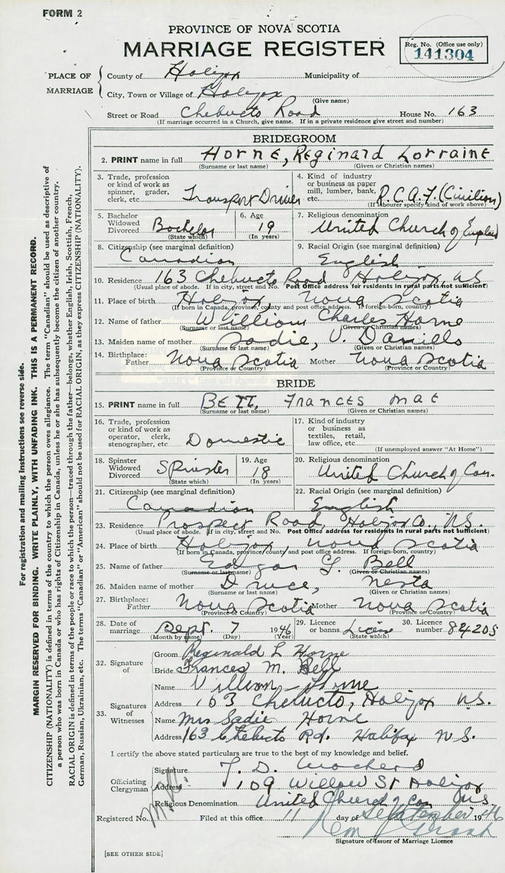 28. Date of marriage September 7 1946 29. By license or banns License 30. License number 84205