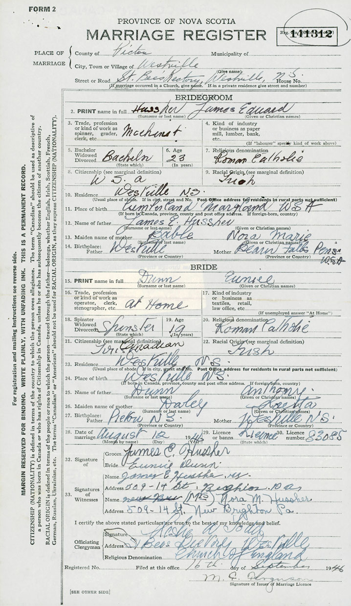 28. Date of marriage August 12 1946 29. By license or banns License 30. License number 83085