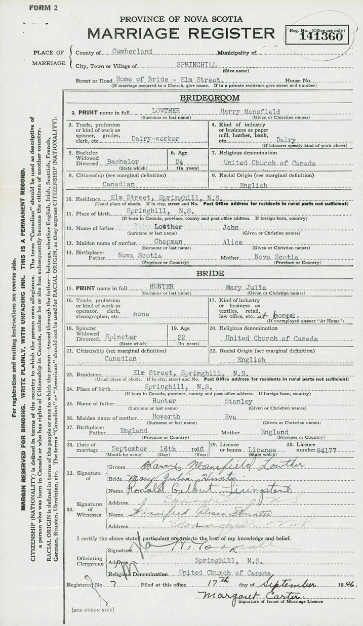 28. Date of marriage September 16 1946 29. By license or banns License 30. License number 84177
