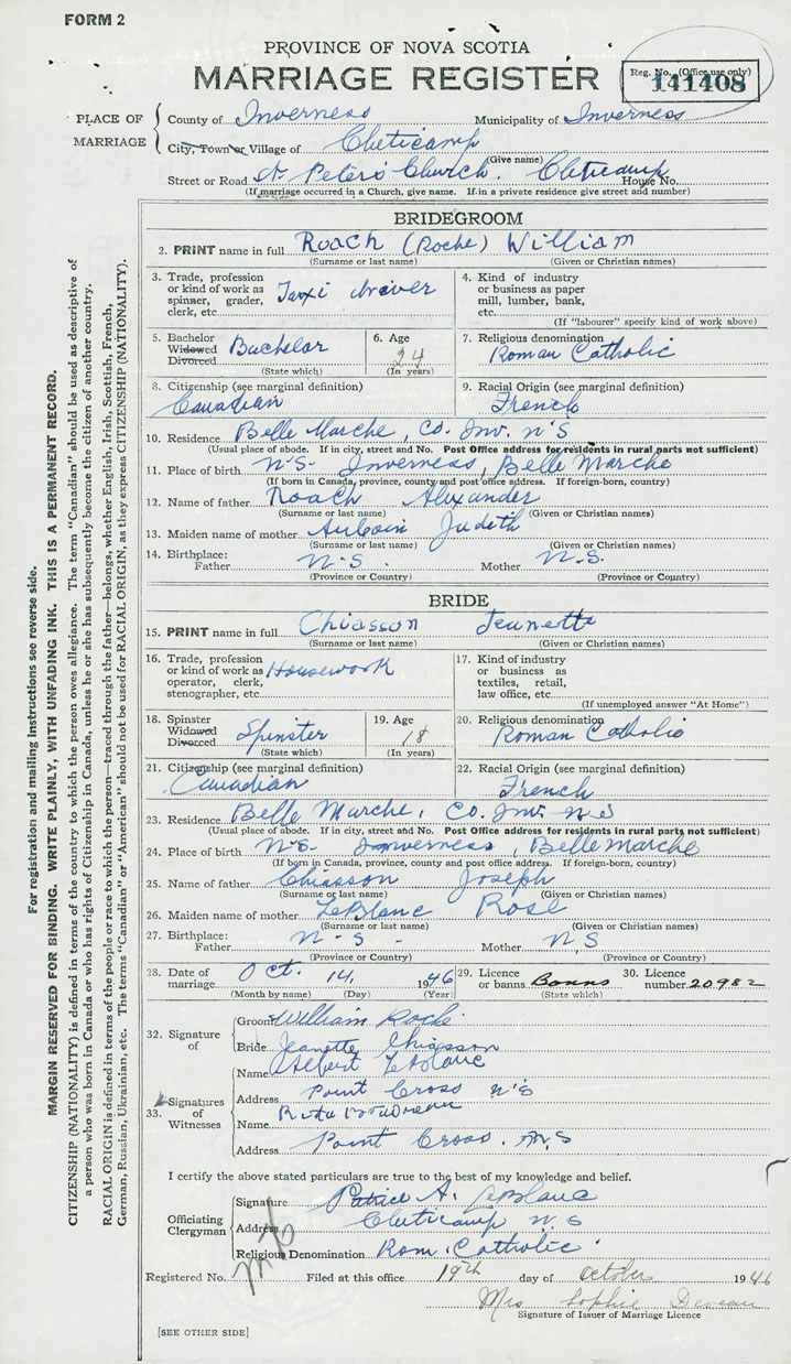24. Place of birth Nova Scotia, Inverness County, Belle Marche