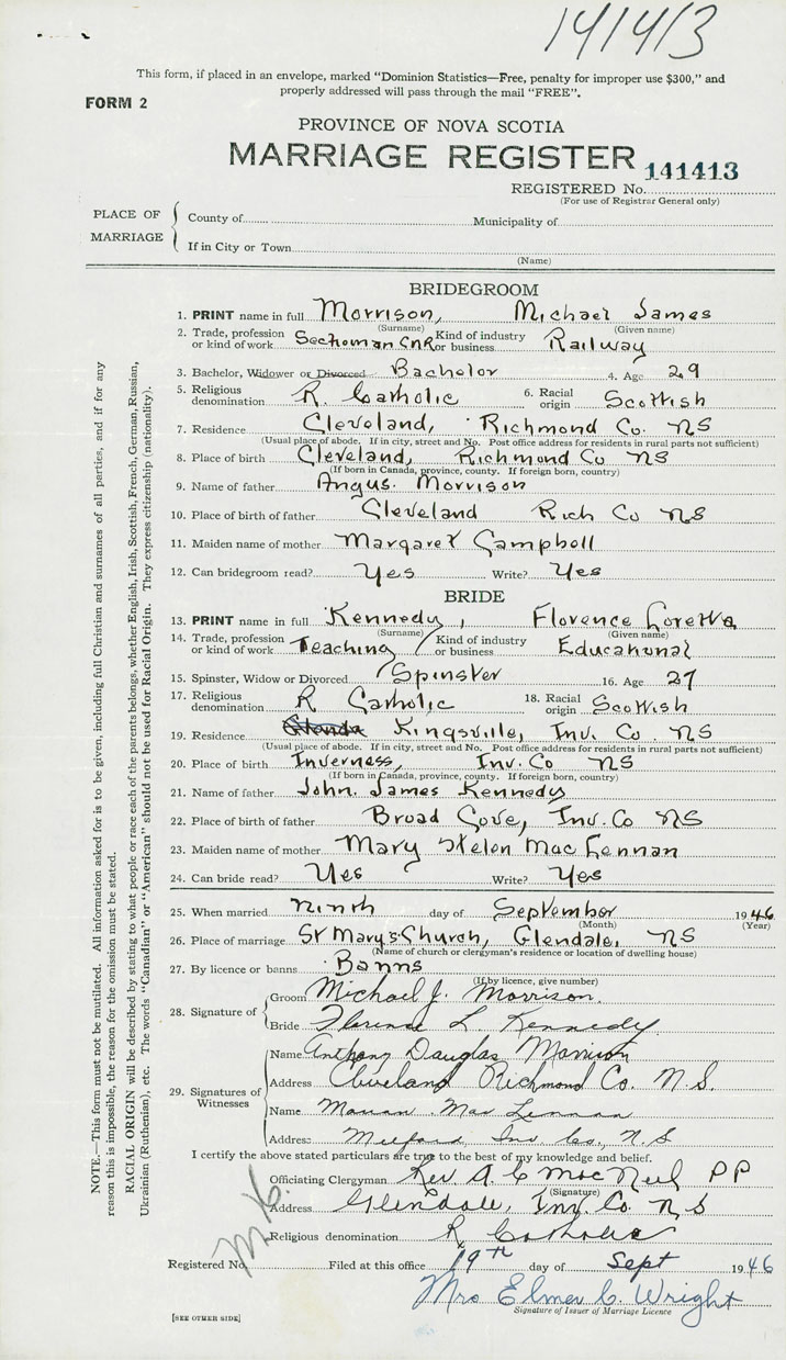 26. Place of marriage St. Marys Church Glendale, Inverness County