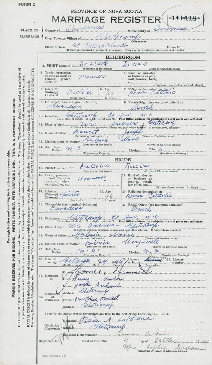 24. Place of birth Nova Scotia, Inverness County, Cheticamp