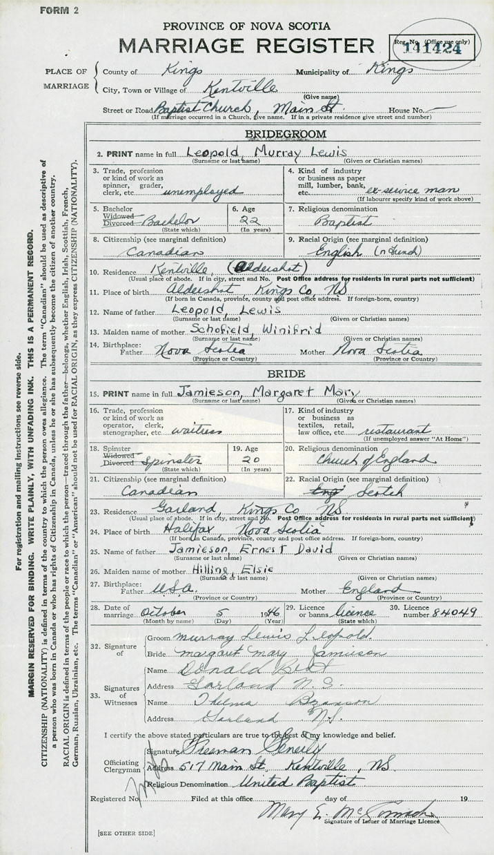 28. Date of marriage October 5 1946 29. By license or banns License 30. License number 84049