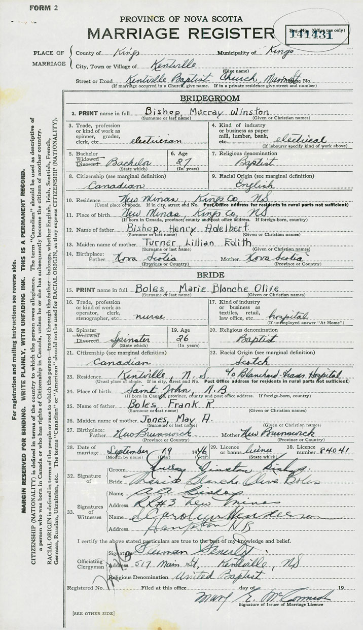 28. Date of marriage September 19 1946 29. By license or banns License 30. License number 84041