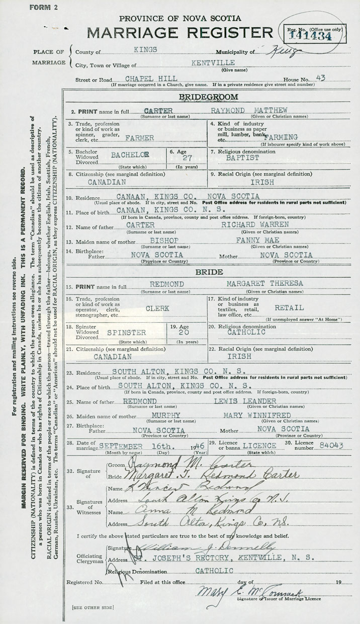 28. Date of marriage September 16 1946 29. By license or banns License 30. License number 84043