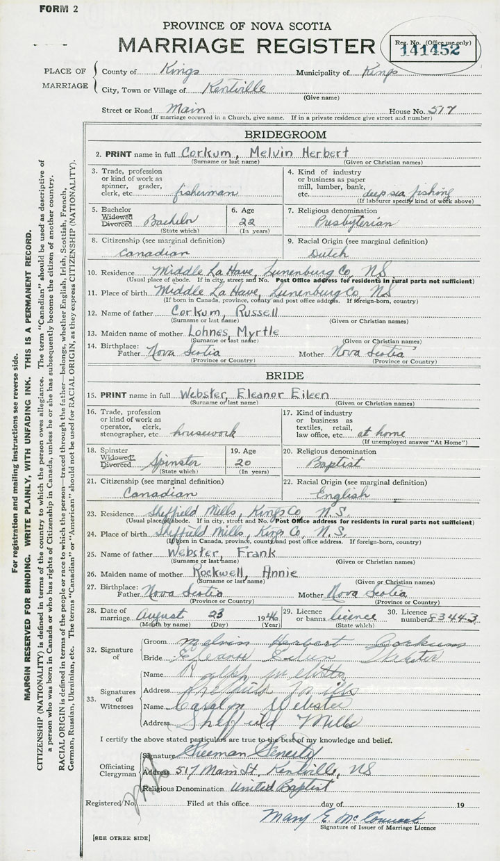Groom Melvin Herbert Corkum