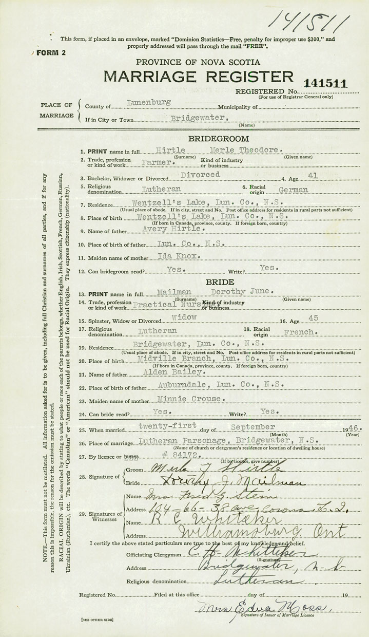 PLACE OF MARRIAGE County of Lunenburg in City or Town Bridgewater