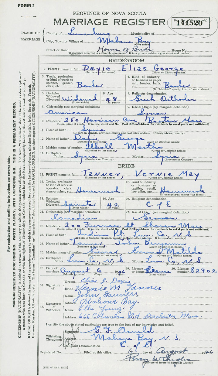 28. Date of marriage August 6 1946 29. By license or banns License 30. License number 82902