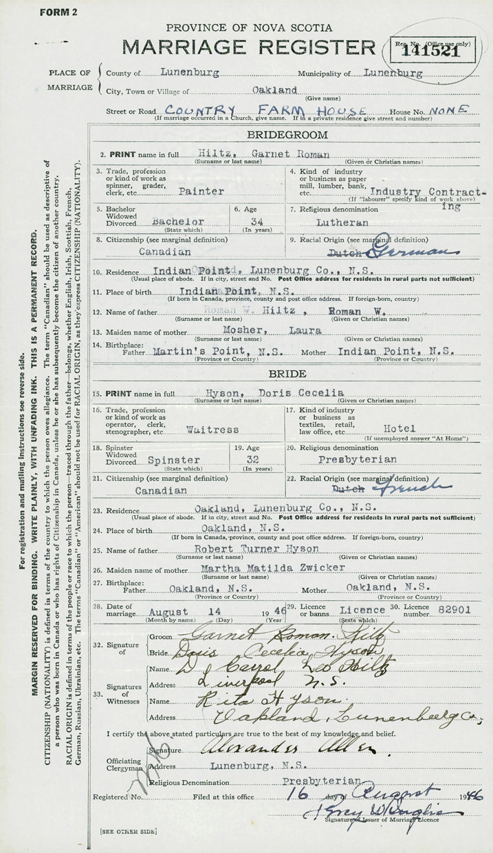 28. Date of marriage August 14 1946 29. By license or banns License 30. License number 82901