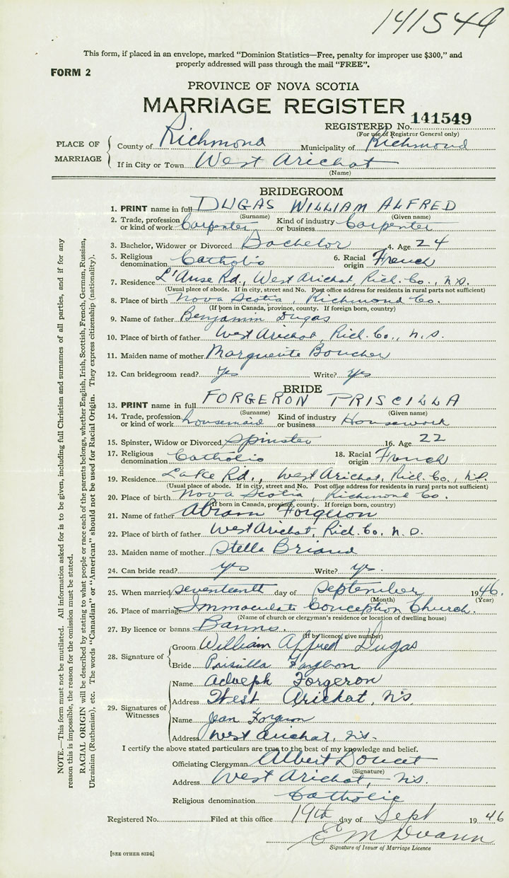 26. Place of marriage Immaculate Conception Church West Arichat, Richmond County