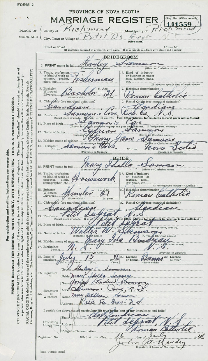 14. Birthplace Father Samson's Cove Mother Nova Scotia