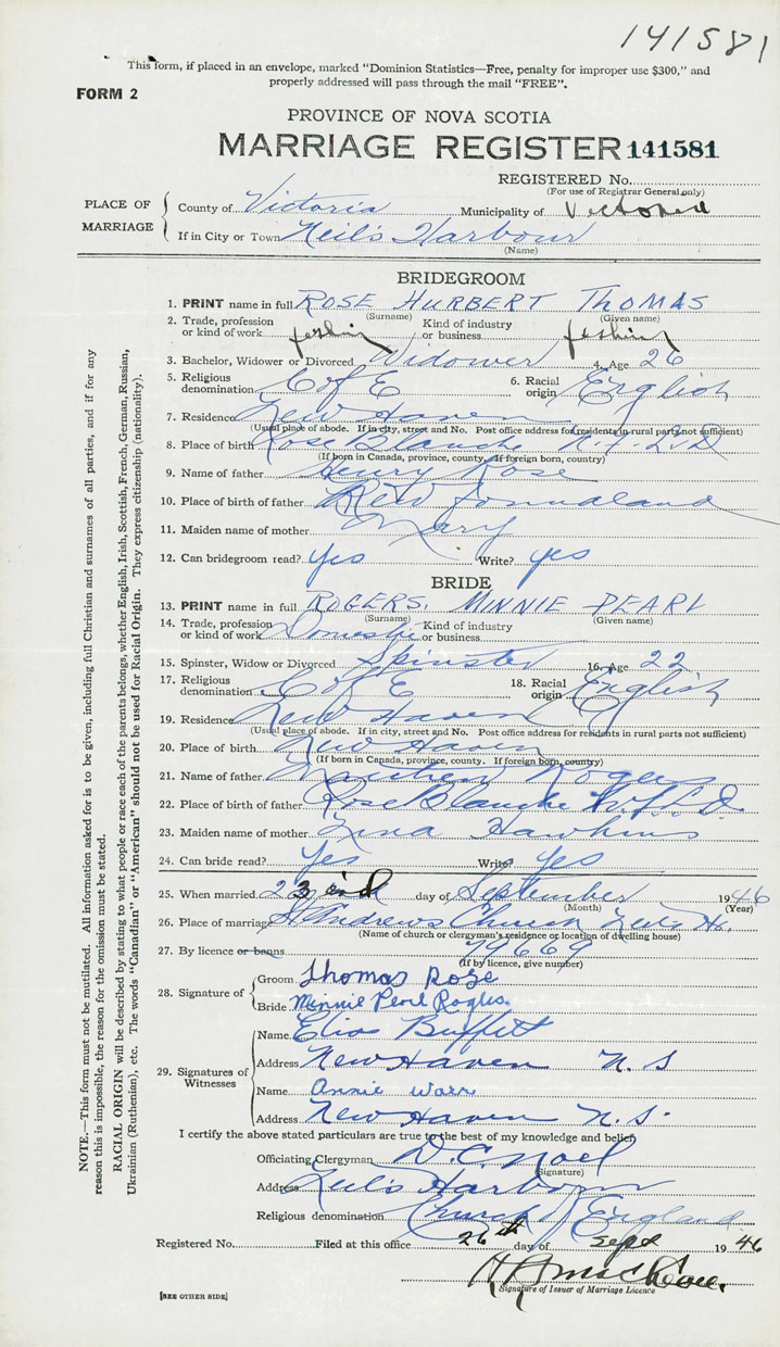 PLACE OF MARRIAGE County of Victoria in City or Town Neils Harbour