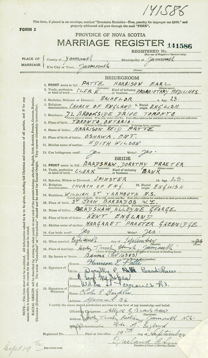 26. Place of marriage Holy Trinity Church Yarmouth, Yarmouth County