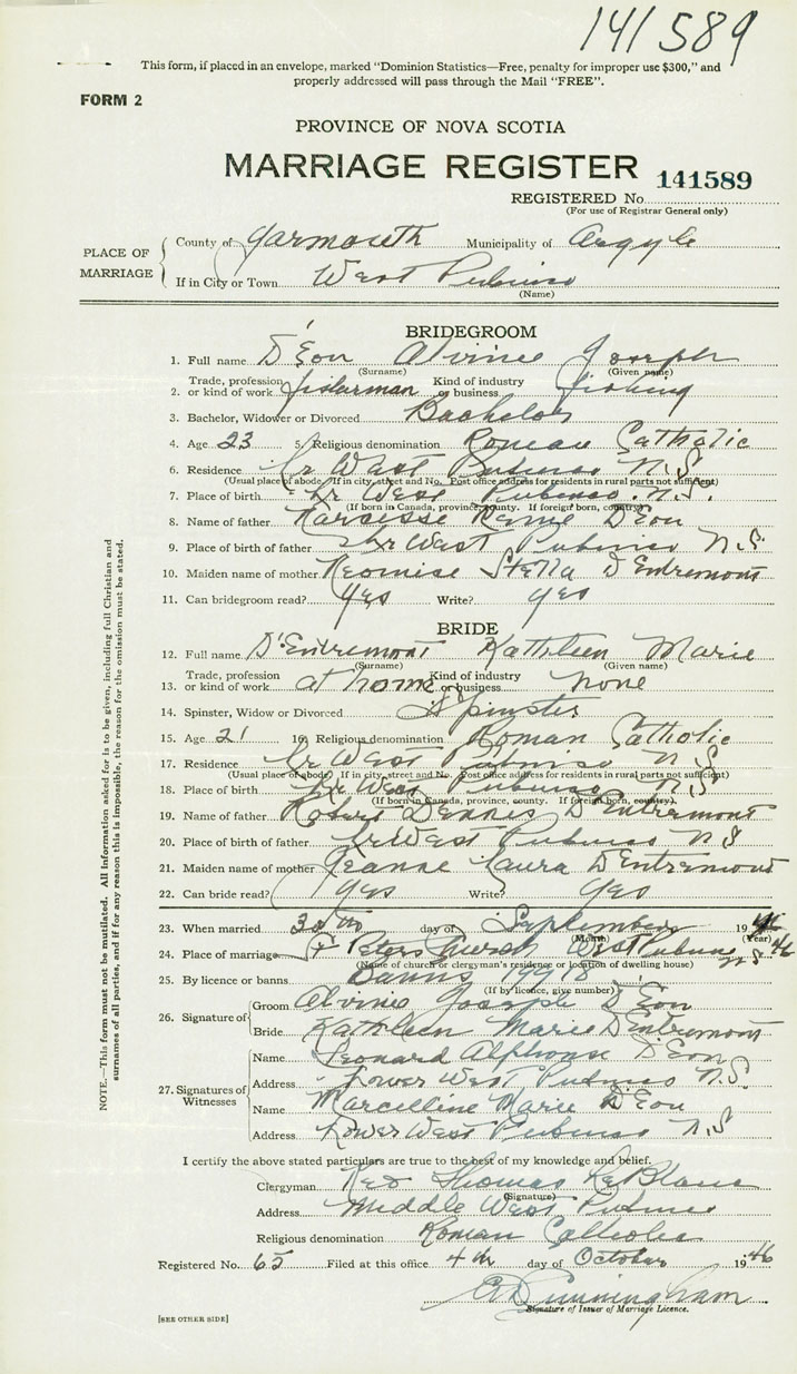 26. Place of marriage St. Peters Church West Pubnico, Yarmouth County