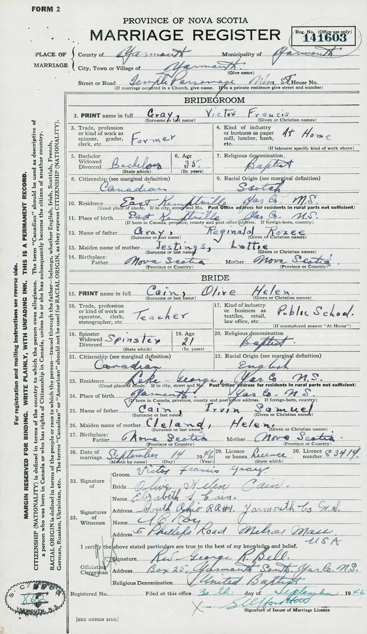 28. Date of marriage September 14 1946 29. By license or banns License 30. License number 83419