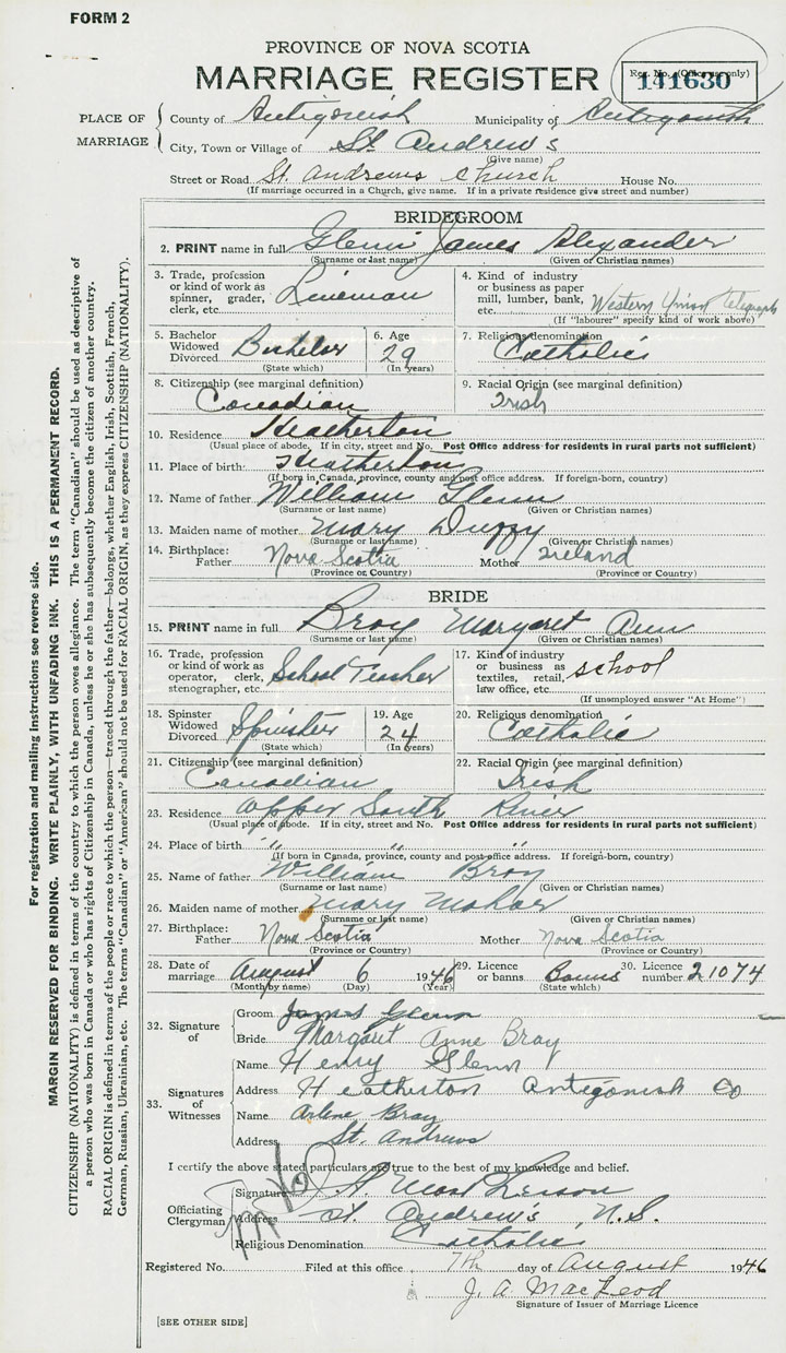 PLACE OF MARRIAGE County of Antigonish