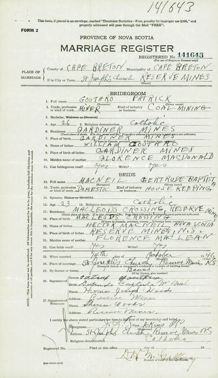 26. Place of marriage St. Josephs Church Reserve Mines, Cape Breton County