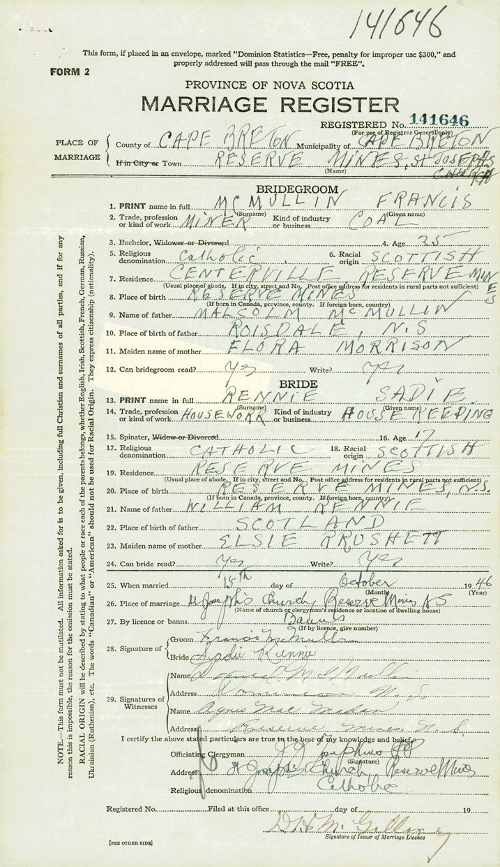 PLACE OF MARRIAGE County of Cape Breton in City or Town Reserve Mines
