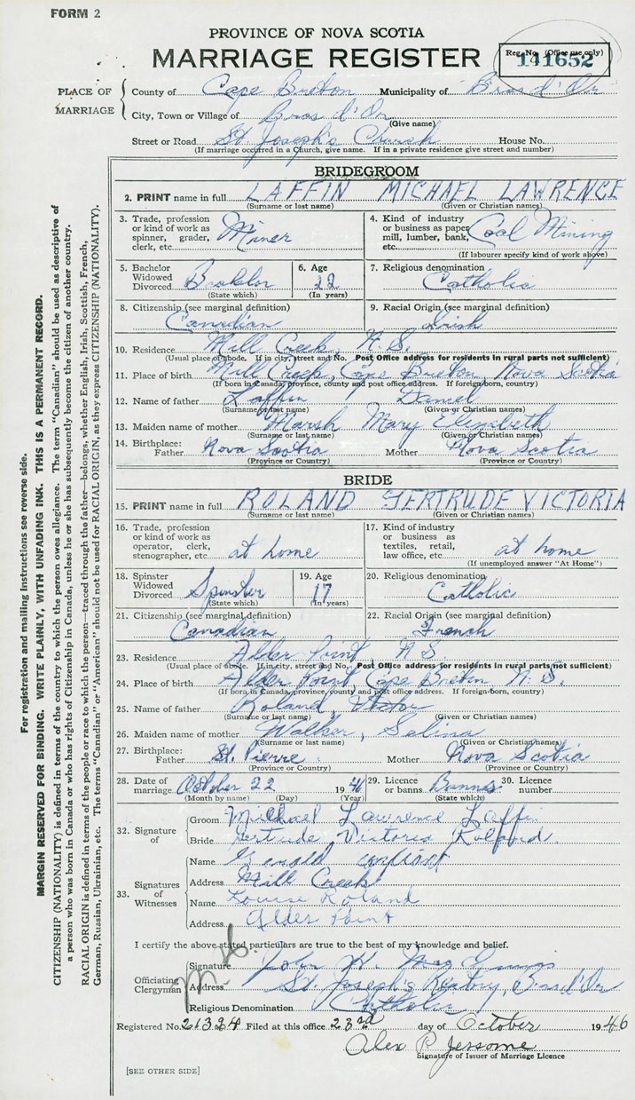 11. Place of birth Mill Creek, Cape Breton