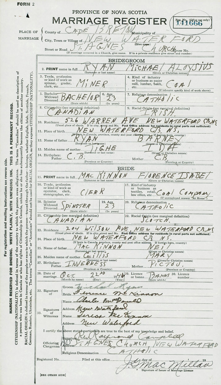 28. Date of marriage October 22 1946 29. By license or banns Banns 30. License number Banns