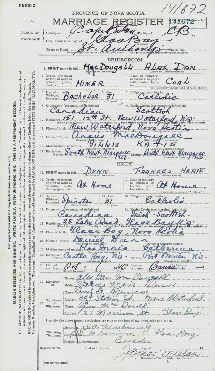 PLACE OF MARRIAGE County of Cape Breton