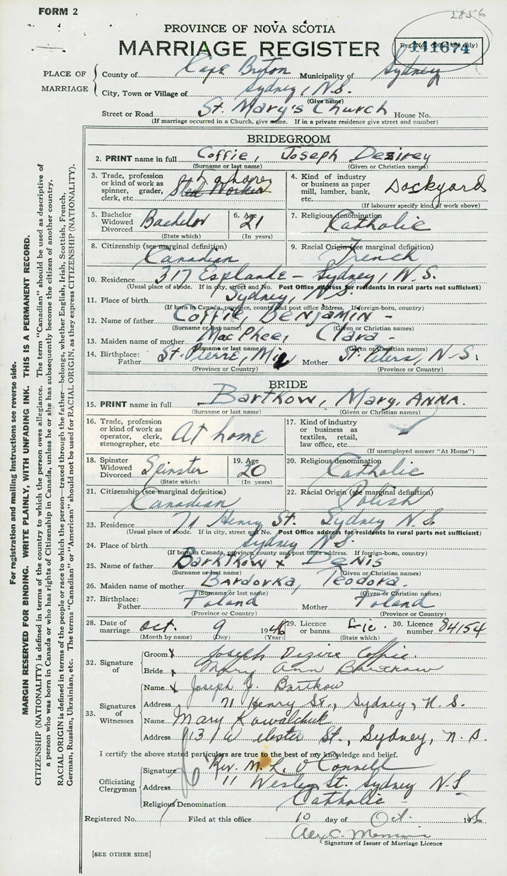 28. Date of marriage October 9 1946 29. By license or banns License 30. License number 84154