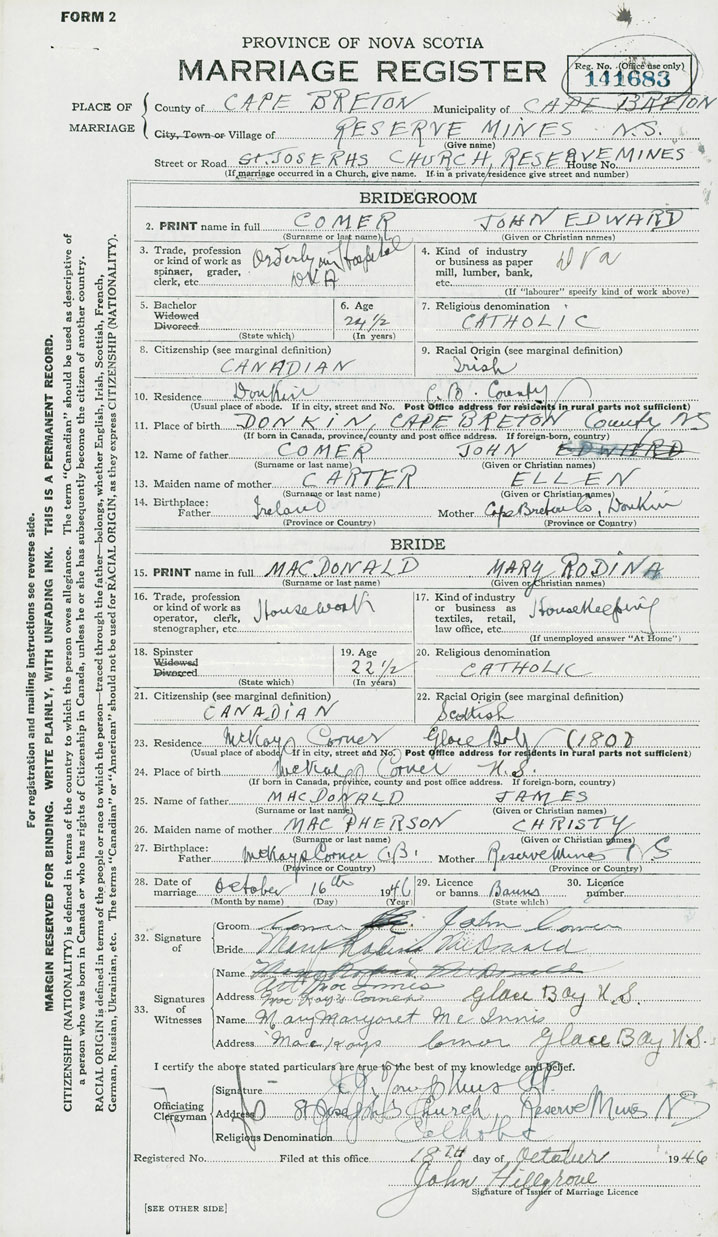 24. Place of birth McKay's Corner, Glace Bay