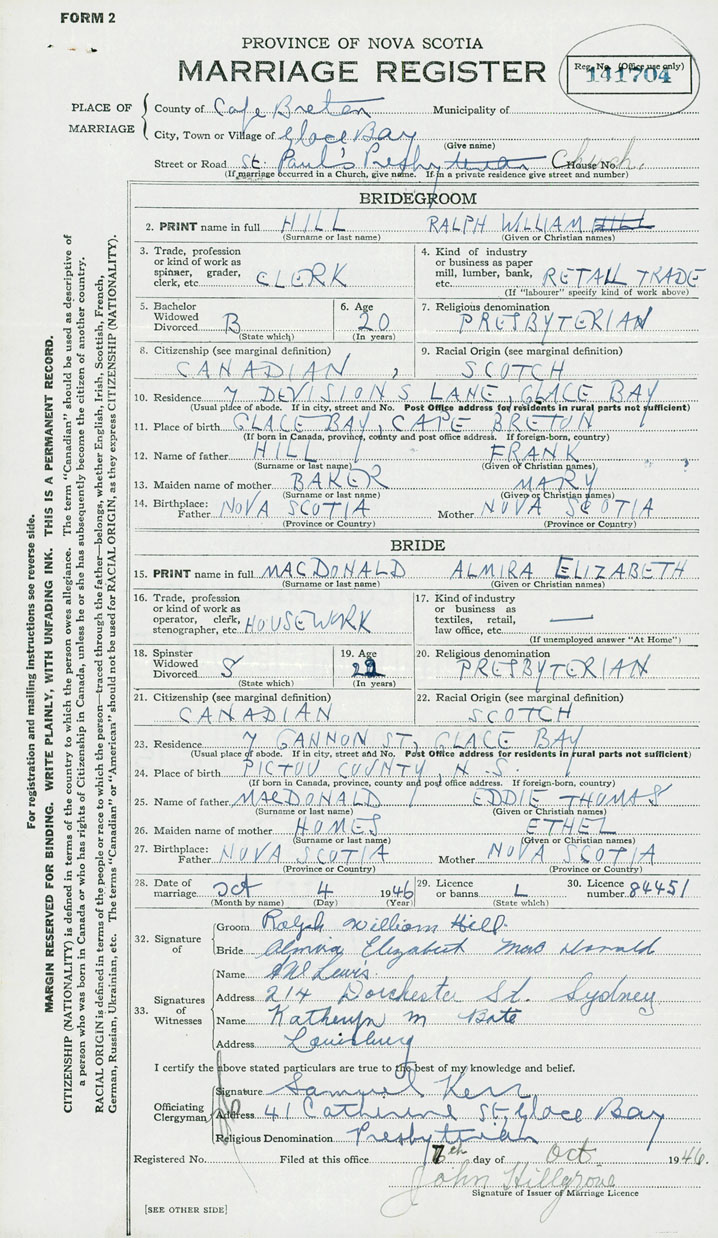 28. Date of marriage October 4 1946 29. By license or banns License 30. License number 84451