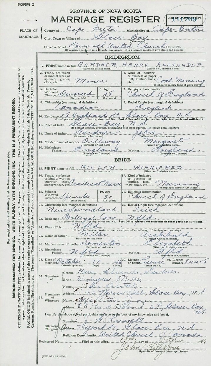 28. Date of marriage October 17 1946 29. By license or banns License 30. License number 84458