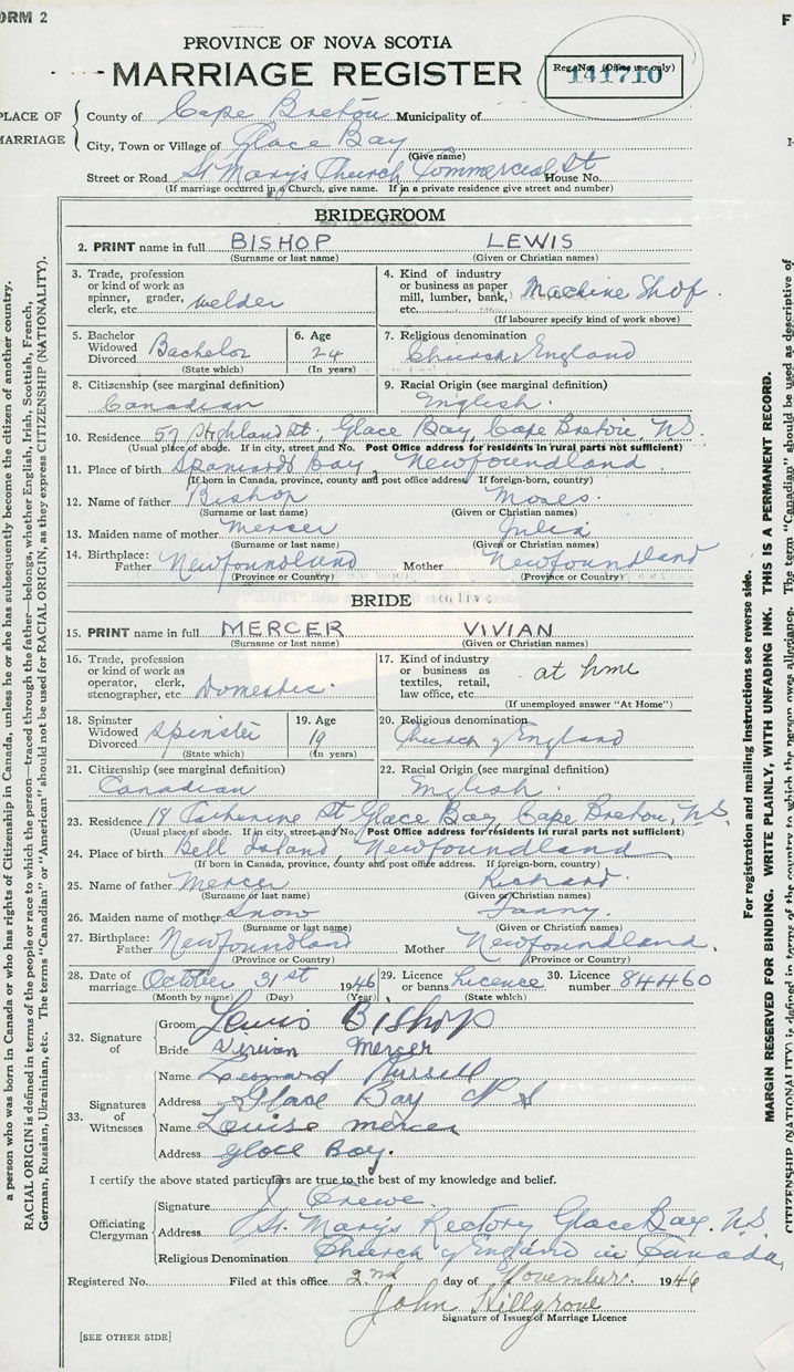 28. Date of marriage October 31 1946 29. By license or banns License 30. License number 84460