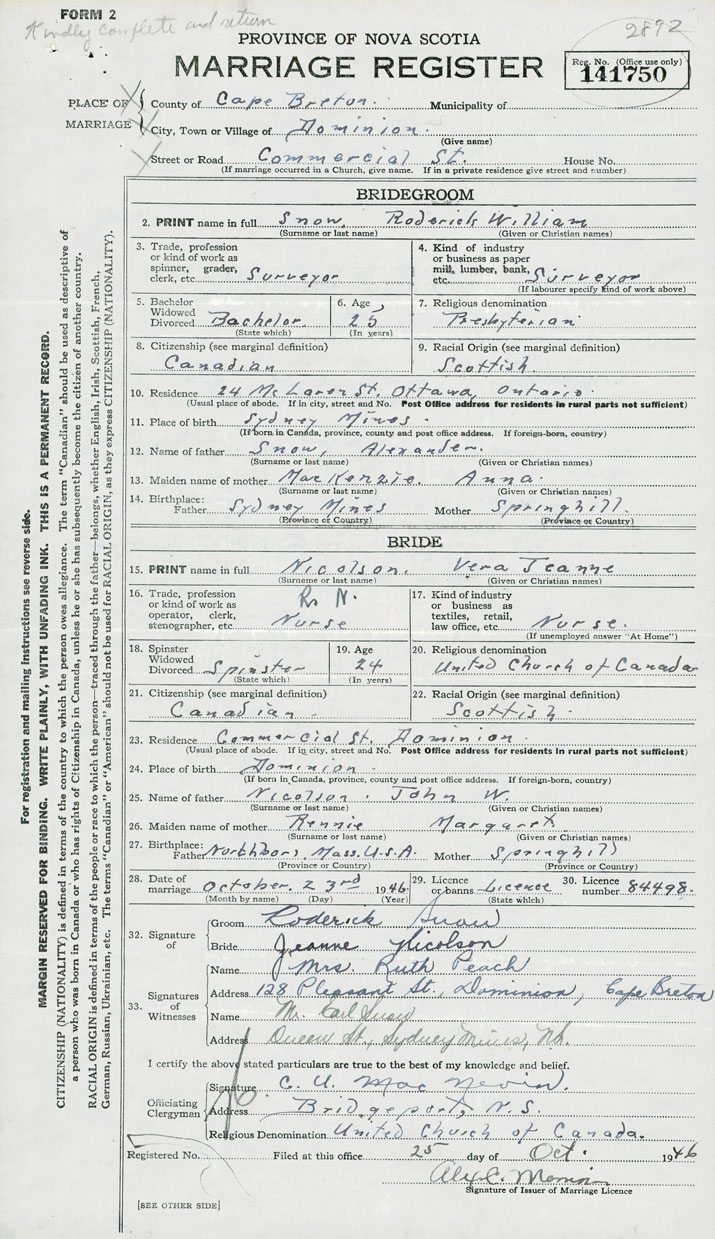 28. Date of marriage October 23 1946 29. By license or banns License 30. License number 84498