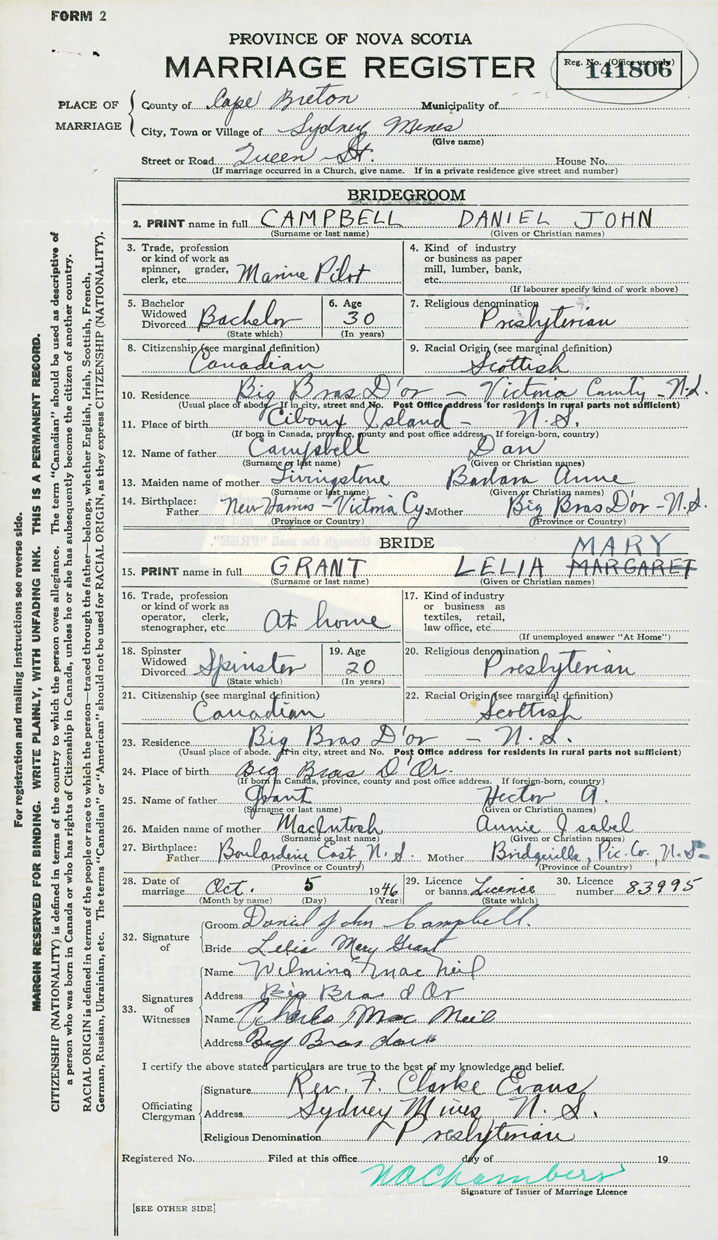 28. Date of marriage October 5 1946 29. By license or banns License 30. License number 83995