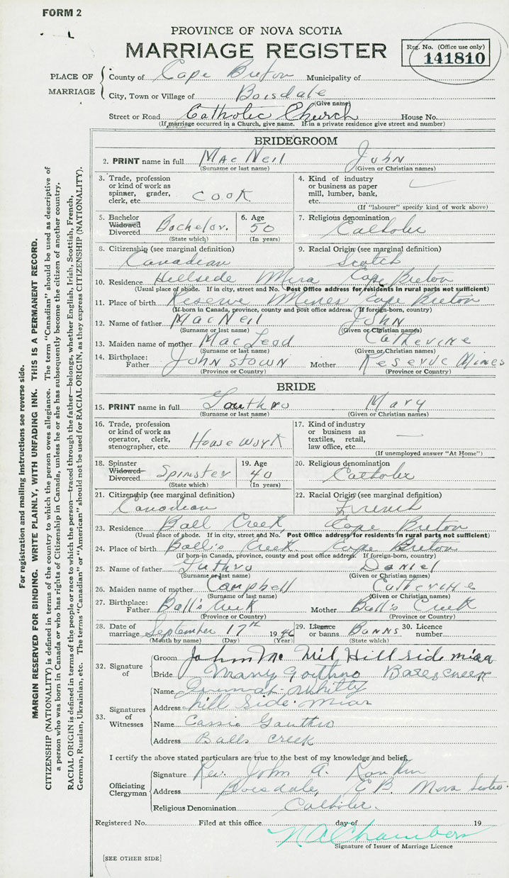 24. Place of birth Ball's Creek, Cape Breton
