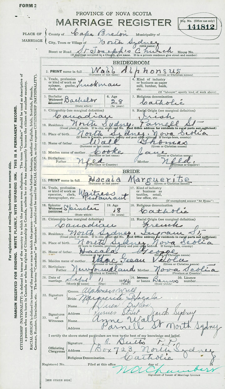 27. Birthplace Father Newfoundland Mother Nova Scotia