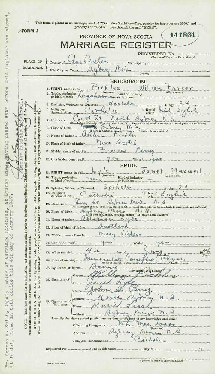 26. Place of marriage Immaculate Conception Church Sydney Mines, Cape Breton County