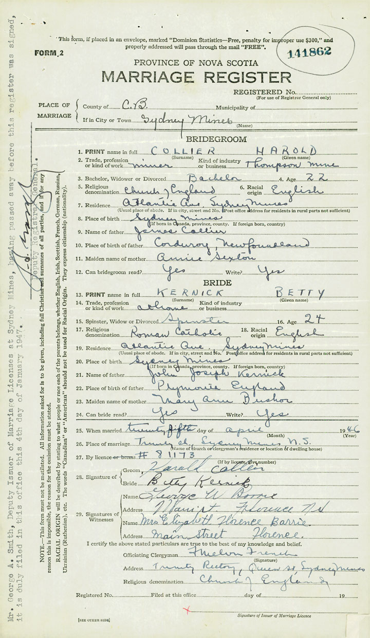 26. Place of marriage Trinity Church Sydney Mines, Cape Breton County