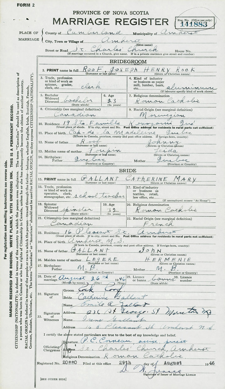28. Date of marriage August 26 1946 29. By license or banns License 30. License number