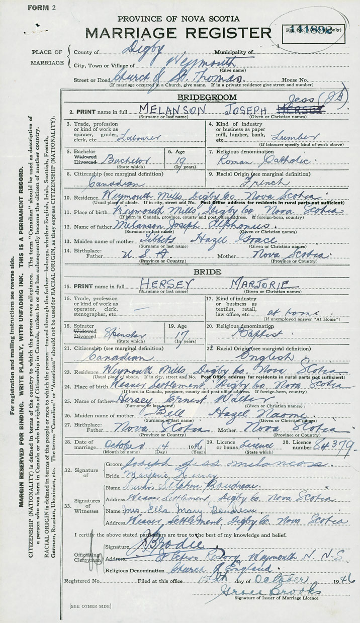 28. Date of marriage October 14 1946 29. By license or banns License 30. License number 84379