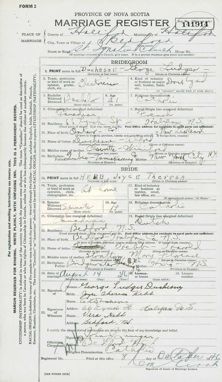 28. Date of marriage August 14 1946 29. By license or banns License 30. License number