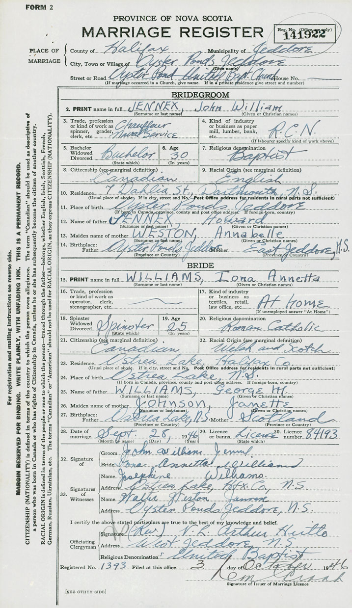 28. Date of marriage September 28 1946 29. By license or banns License 30. License number 84193