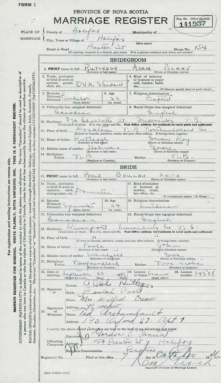 28. Date of marriage September 23 1946 29. By license or banns License 30. License number 84508