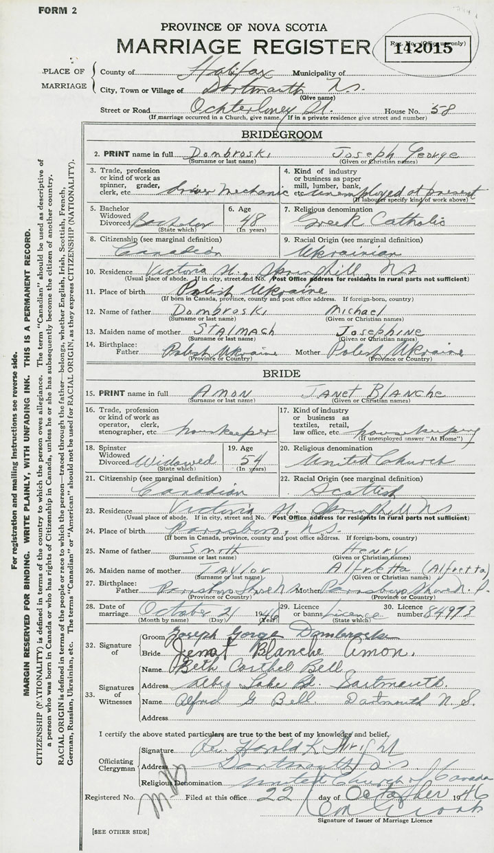 28. Date of marriage October 21 1946 29. By license or banns License 30. License number 84973