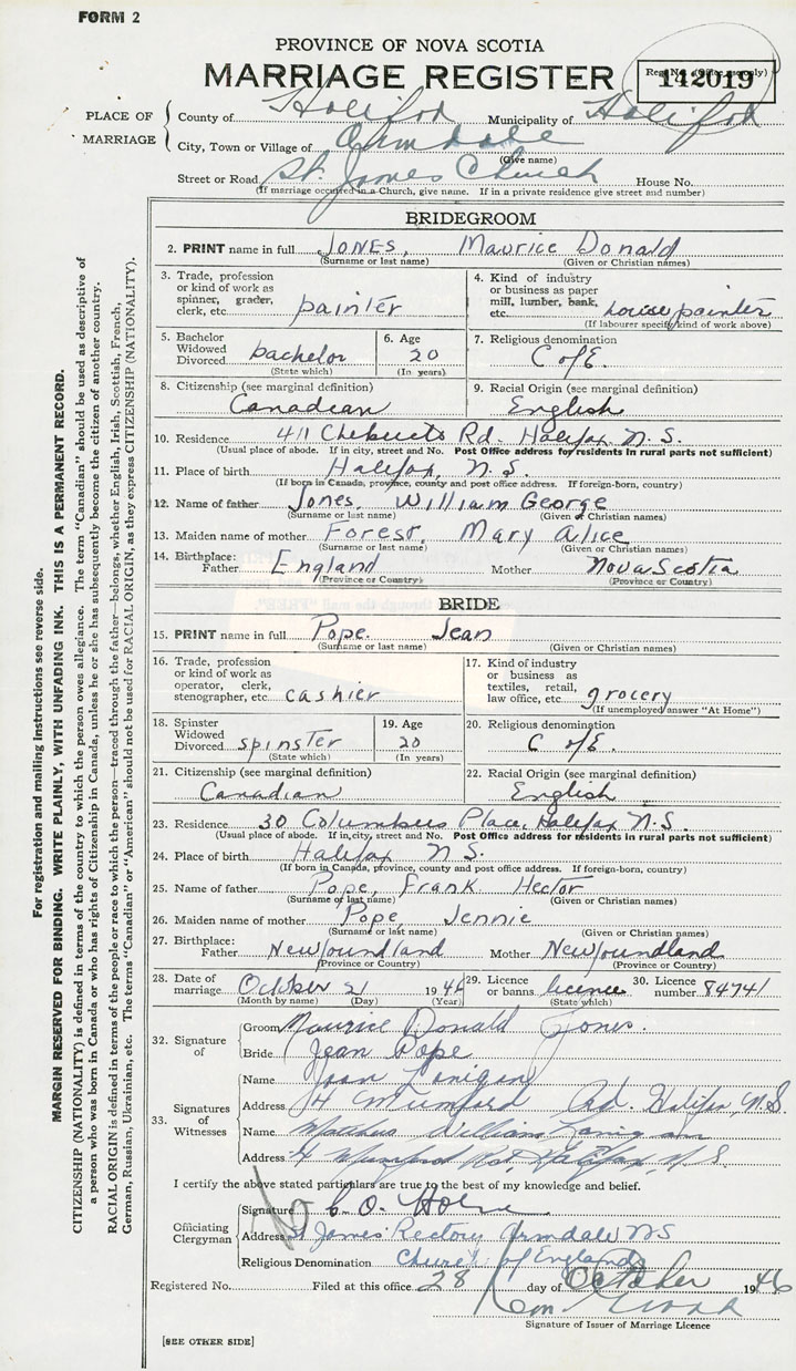 28. Date of marriage October 21 1946 29. By license or banns License 30. License number 84741