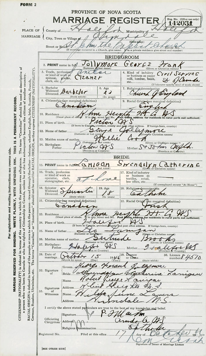 28. Date of marriage October 15 1946 29. By license or banns License 30. License number 84510