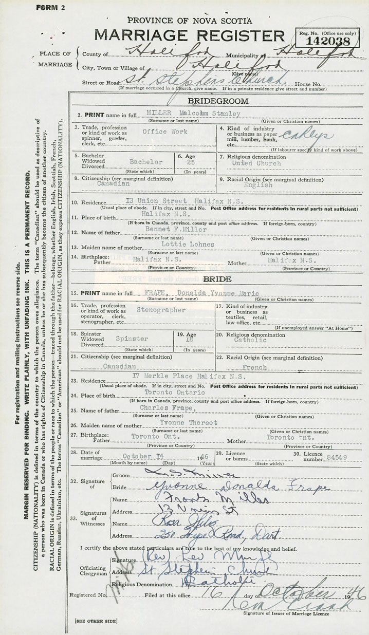 28. Date of marriage October 14 1946 29. By license or banns License 30. License number 84549