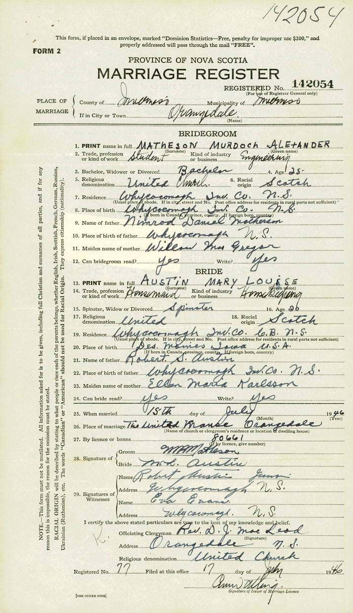 26. Place of marriage The United Manse Orangedale, Inverness County